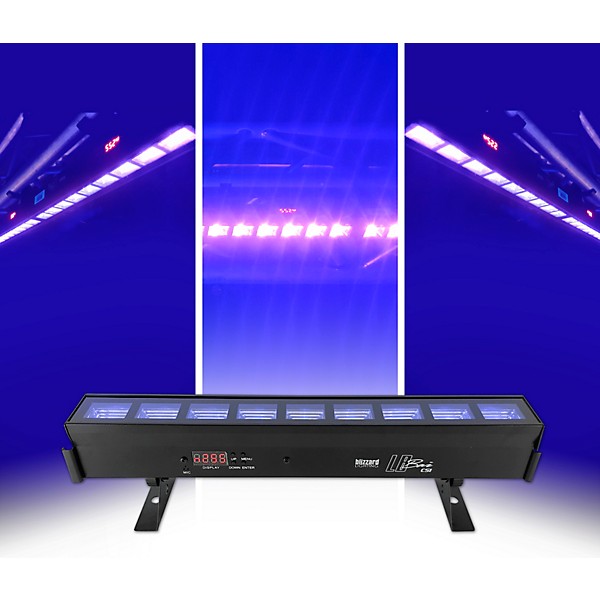 LB Bar CSI is a linear UV wash fixture from Blizzard. The LB Bar CSI boasts nine bright 3W ultraviolet LEDs. It’s perfect for clubs, DJs, or any indoor application. The Blizzard LB Bar CSI black light has a 4-button LED control panel which is very user friendly. The panel allows control of 0-100% UV output level, 0-20Hz strobe, standard dimming plus 4 selectable 32-bit dimming curves It’s totally silent due to its passive cooling design. The Blizzard LB Bar CSI black light is equipped with locking end alignment clips. These allow seamless multi-fixture light output with no color breaks. The LB Bar CSI is light weight, solidly built, and also offers dual mounting brackets with locking knobs, IEC power in/out, and 3-pin DMX input/output connections.