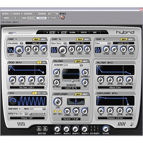 Whether you use it in the studio or in a live situation, Hybrid is built to be played. Use the step sequencers for arpeggiation or phrase generation. Set the modulation matrix to easily map modulations from sources to destinations. And set up "morph groups" to modify sounds on the fly, from the interface or a MIDI controller.