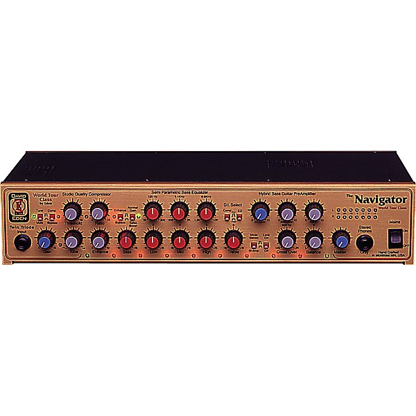 The exciting Eden WP-100 Navigator Bass Preamp features a tube input stage, compressor with variable threshold and rate controls, tube character control, enhance control, and Eden's famous semi-parametric EQ. The WP-100 Bass Preamp also features D.I. output control on the front of the unit, a mono pre-EQ loop, stereo post-EQ, side-chain loop with front panel blend pot, variable crossover, stereo LED ouptut meters, tuner out, stereo and mono XLR ouptuts, and a defeatable limiter. Eden duplicates front-panel controls for compressor defeat, enhance, mute-to-tune, and turbo boost on a footswitch with lighted indicators that you connect to the WP-100 Navigator Bass Preamp via a standard MIDI cable.