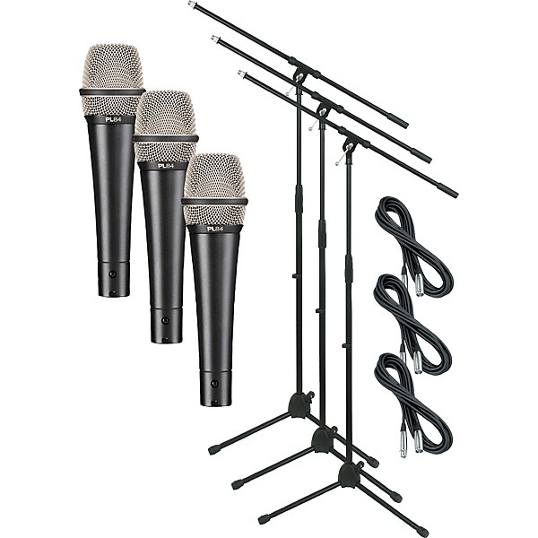 The PL84 handheld condenser mic delivers a high-performance blend of a warm low end, smooth and musical midrange, and silky high frequency presence. It is ideal for vocal styles requiring the finesse and articulation of a condenser, coupled with a forgiving cardioid polar pattern for expressive mic techniques. The PL84 seriously challenges the performance characteristics of competitive condenser models costing twice as much. This package includes three PL84 microphones, three tripod stands, and three 20' XLR cables.