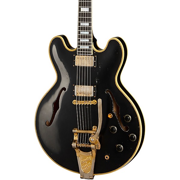 Every visual and tactile detail is refined through Gibson’s Murphy Lab aging process to authentically recreate decades of real-world wear. The ebony nitrocellulose finish displays subtle checking and softened edges, while metal hardware shows convincing patina and natural fade. Appointments include a Bigsby B7 vibrato tailpiece, ABR-1 wire bridge and Grover Rotomatic tuners with milk bottle buttons, all finished in Murphy Lab aged gold. Rather than appearing artificial, the aging feels organic and cohesive, giving the instrument the confidence, familiarity and visual authority of a well-traveled original.
