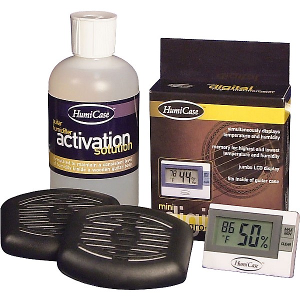 The Humicase Humidity Control Kit comes with 2 humidifying pods to mount inside your ionstrument case; an 8-oz. bottle of a special activation solution; and the Mini Digital Hygro-Thermometer. Specially treated sponges inside the pods gradually release humidity. After the fluid is depleted, they can be maintained with distilled water.