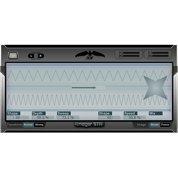 The KR-Imager STR supports two stereo image animation methods and an additional freeze morph function which are used to provide dynamic time variable stereo imaging. Foremost, the algorithmic sweep method, whereas the selected algorithmic 'filter' or transform is changing the frequency response bands according to a user specified change rate. Furthermore, a morph method, whereas two different algorithms are combined (morphed) in realtime according to a user specified rate.