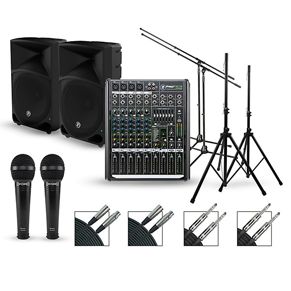 These premium Mackie PA packages make it easy to get started quickly with everything you need to hit the stage. We’ve done all the work for you and hand-selected the components for optimum performance. Each package delivers your choice of a pair of 12 in. or 15 in. Mackie Thump powered speakers, a Mackie ProFXv2 Series mixer, a pair of speaker stands and a pair of speaker cables. Rounding out the packages are dynamic handheld microphones, boom mic stands and mic cables. No matter your choice, each package is loaded with high-end technology and components for a powerful live performance.