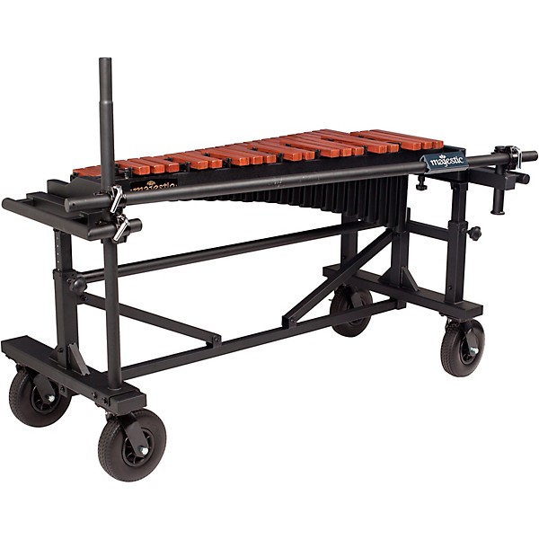 Majestic Quantum series xylophones utilize Majestic's newly formulated synthetic bar material that has a warm tone and a wood-like appearance. Traditional American-style tuning methods are employed with the utmost accuracy to ensure a bright and musical tone. Other features include full slant resonators with gold finish, pneumatically assisted height adjustment, and 8" pneumatic wheels for easy moving on the field.
