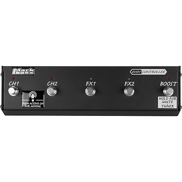 The optional MB EVO 1 Controller allows to switch between channel 1 and channel 2 and mix the two channels, turn on/off the FX1, FX2 and boost, plus accessing the tuner with mute function pressing and holding the boost switch. The Markbass EVO 1 can be controlled also via programmable MIDI pedalboard.