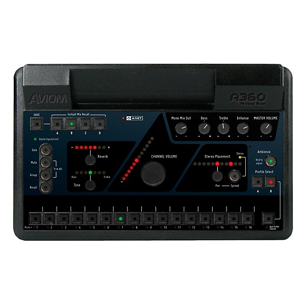 Aviom's A360 Personal Mixer brings new levels of control and customization to personal mixing and is the perfect solution for controlling musicians' monitors on stage or in the studio. It includes an advanced 36-channel mix engine which can be used to mix up to 16 mono or stereo standard channels plus mono or stereo ambience and the unique Dual Profile Channel. Channels can be individually selected for each A360 from a network pool of up to 64 channels. The A360 has been designed specifically to enhance the experience of in-ear monitor users and it also works great with headphones in the studio.