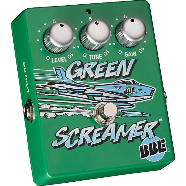 The BBE Green Screamer pedal delivers a creamy, tube-like, dynamically responsive overdrive that won't mask the tone of your guitar and amp. This pedal has three main controls: Gain, Tone, and Level, and a true hardware bypass switch, and can be powered by a 9V battery or AC adapter. Use a Green Screamer pedal as a stand-alone overdrive, adding overdrive to a single-channel amplifier. You can also use it as a solo booster also, not necessarily as a transparent solo booster, but a booster that has a midrange characteristic to boost solos or just to chunk up rhythms.