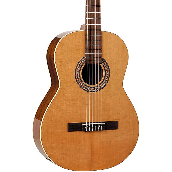 The La Patrie Concert Classical Guitar has a solid cedar top and solid mahogany back and sides. Also features mahogany neck with rosewood fretboard, rosewood bridge with compensated saddle, gold "lyra" style tuners with pearloid buttons, and semi-gloss satin finish. The Concert guitar is La Patrie's top-of-the-line of the mahogany/cedar models. The Concert receives eight coats of lacquer that are buffed down to a highly responsive high gloss finish. This special process takes eight days to complete.