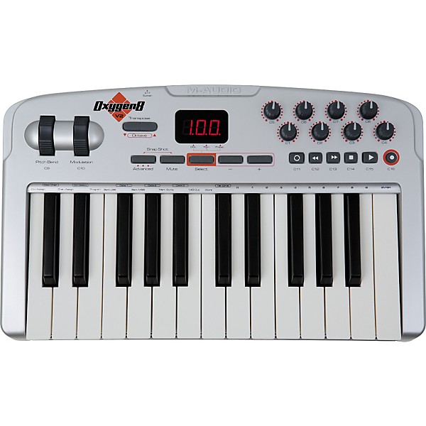 The M-Audio Oxygen 8 v2 25-Key USB MIDI Controller is a 25-note velocity-sensitive, synth-action keyboard with +/-4 octave transposition. You get hands-on control of any 8 MIDI-assignable parameters within your favorite software programs. The Oxygen 8 v2 speaks directly to your computer without any extra devices or even a MIDI interface. Upgrades from the original version include class compliancy, transport controls, Enigma software editor for setup management, snapshot function, and plus/minus data buttons. Like the original Oxygen 8 keyboard controller it features 8 MIDI assignable knobs, one assignable slider, and a 25-key keyboard controller. It inputs and outputs 16 channels of MIDI to the computer via its USB port. Powered by USB or optional power supply, the M-Audio Oxygen 8 is light, compact, and highly portable.