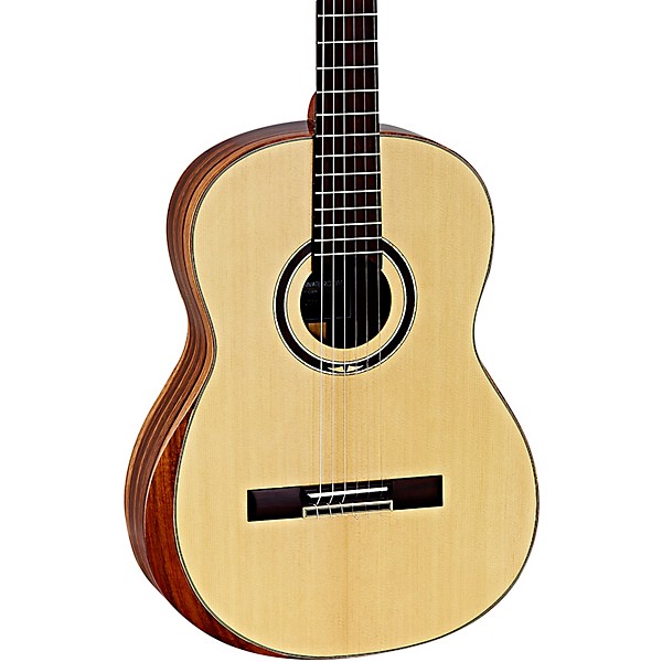 The Ortega Guitars Private Room Series, which includes this STRIPEDSUITE acoustic guitar, starts with handpicked tonewoods that are set aside to be custom-crafted into exclusive guitars. Their selection is limited in production and truly unique. A refreshed design to the quality and essence of the classical guitar, the STRIPEDSUITE features a solid Alaska spruce top and striped ebony back. It's perfect for a seasoned guitar player looking to add a nylon sound to their arsenal. While still using the traditional Spanish heel, it offers a more comfortable neck option for today’s player. It also comes with a 12-hole bridge, which provides a greater break angle for a cleaner, crisper sound and faster string replacement.