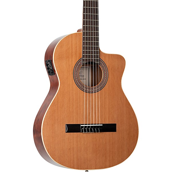 The Ortega Traditional Series RCE180G Acoustic-Electric Classical Guitar blends traditional Spanish craftsmanship with premium tonewoods and modern performance features. Handmade in Spain, this nylon-string classical features a solid North American cedar top paired with bubinga back and sides, delivering a warm, articulate voice with rich low end and clear, responsive highs. With its full gloss finish, elegant maple binding and classical rosette, the RCE180G offers both refined tone and striking visual appeal for players at any level.