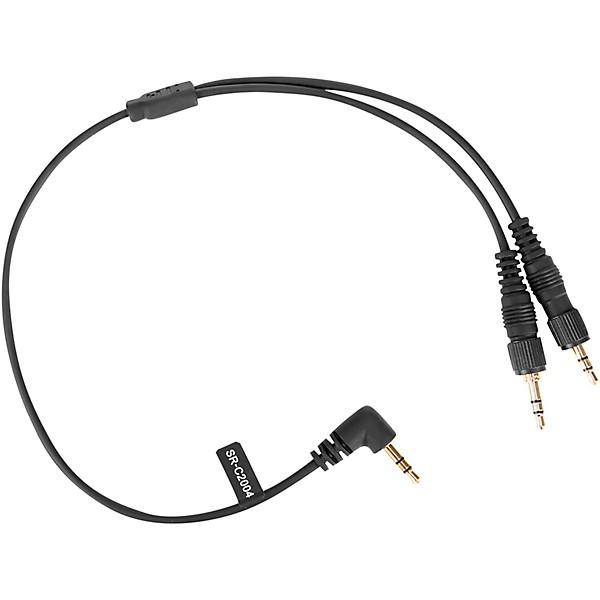 The Saramonic SR-C2004 is a short cable that lets you connect two 3.5mm wireless receivers or audio sources into a single 3.5mm mic input of a camera, mixer, recorder or other device. It has two locking 3.5mm male connectors and ends in a single right-angle 3.5mm male connector. The locking connectors are compatible with wireless receivers that have locking outputs and work with receivers or other audio sources that have regular 3.5mm outputs as well. All of the parts are gold-plated, which provides the best possible signal transfer and resists corrosion.