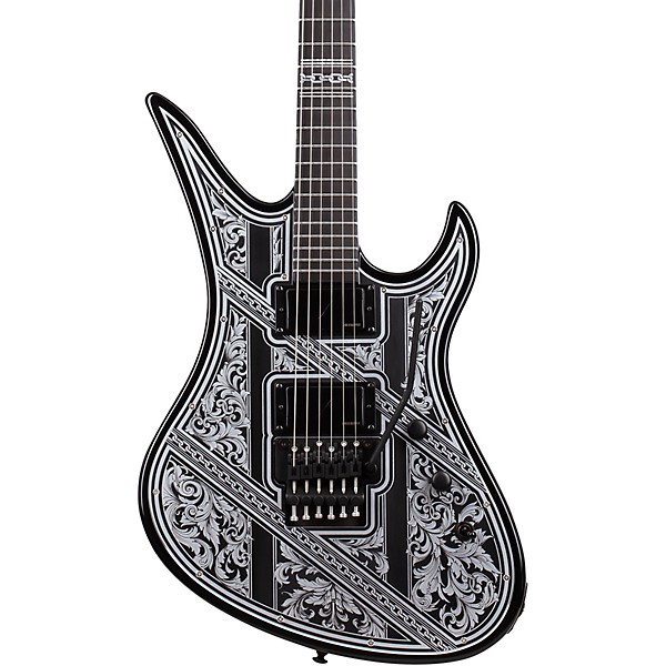 The Avenger FR Przym Palladium electric guitar stands out with its Palladium silver aluminum metal top, featuring Baroque-inspired artwork by Przym. This unique design combines timeless artistic elements with a bold, modern aesthetic, creating a visually striking statement piece. Satin black hardware and single-ply binding accentuate the sleek gloss black finish, while the ultra-thin "C" neck profile offers comfort and speed for extended play. Every detail, from the brushed black nickel pickup covers to the intricate fretboard inlays, reflects Schecter's dedication to craftsmanship and innovation.