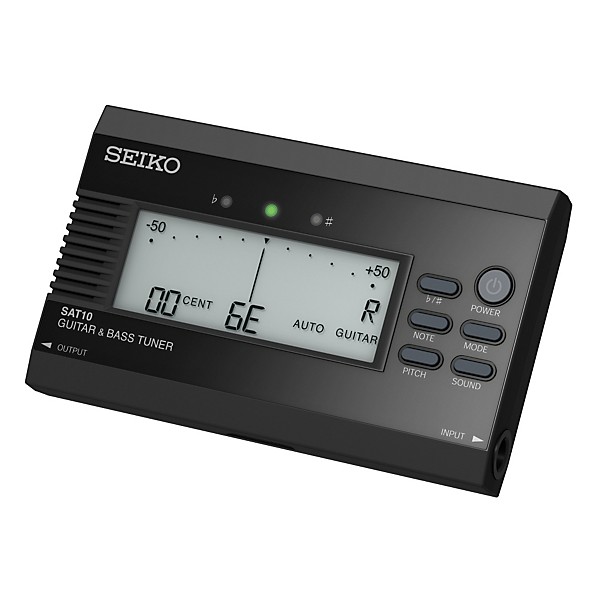 Seiko's SAT10 Guitar/Bass Tuner has a dynamic speaker that produces clear reference tones. Its high-contrast LCD provides high visibility and the digital cent indication offers accurate timing. The guitar tuning range goes from 7B to 1E. The bass tuning range goes from Low B to High C. Black.