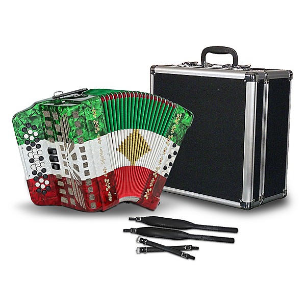 The SofiaMari 34-button diatonic accordion Mexican Flag edition combines a patriotic Mexican flag design with a performance-ready setup designed for steady musical growth. Available in F/Bb/Eb, E/A/D and G/C/F key variations, its 34-button diatonic layout supports the chord progressions and melodic patterns common in Norteño, Tejano, and traditional folk music, allowing players to move through regional standards without switching instruments. Large pearl buttons provide smooth response and clear visual reference points for faster passages, while the 12-bass section delivers strong harmonic support beneath your melody. Whether practicing at home or stepping into early gigs, this SofiaMari accordion offers a balanced, approachable feel that builds confidence with every session.