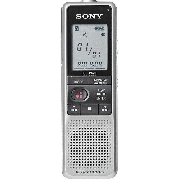 The Sony ICD-P620 recorder has 512MB built-in flash memory, features 4 message folders, single function buttons for simplicity, and date and time stamps on all recordings. There are 3 recording modes”Long Play, Standard Play, High Quality, with a maximum of 261 hours of recording time in LP mode. You can record over and over without any worry of distortion thanks to the ICD-P620 recorder's integrated circuit chip. Its Digital Operated Recording stops the recording during silent pauses then begins recording again without missing a single syllable because of a digital buffer. A full-function display shows the number of messages recorded, recording length, date, time, and battery power remaining. Sony includes 2 AAA batteries with the ICD-P620 Digital Voice Recorder.