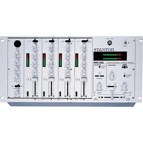 This 4-channel, stereo preamp mixer gives you nine line, 4 phono, and 3 mic inputs. It features gain and 3-band EQ on all 4 channels. Its mic channel section has 2-band EQ, independent level controls, on/off switch, and VCA-controlled autotalk function. A sub-mic on channel 4 enables use of 3-band EQ and panning. Other primo features on the Stanton RM-80 Mixer include a fully assignable crossfader, beat indicators, and balanced XLR master output. The master section features level and balance controls, a mono/stereo switch, and booth output. A cue section features stereo/split function, cue pan, and level control. Input and output LED meters are provided, plus a 12V light BNC input.
