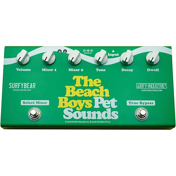 Wouldn’t it be nice to bathe your tone in vintage spring reverb? The Surfy Industries SurfyBear The Beach Boys Pet Sounds Spring Reverb Unit is your gateway. Created to commemorate the 60th anniversary of group’s landmark album Pet Sounds, this limited-edition compact spring reverb pedal brings authentic mechanical reverb character to modern pedalboards. Forming the pedal's nucleus is an authentic Accutronics-type spring reverb pan paired with a JFET-based circuit design inspired by the circuitry of classic early-’60s standalone reverb units—replacing the original tube stages with reliable transistor technology. Dual mixer controls allow players to switch between two reverb settings, while dedicated Decay, Dwell and Tone controls provide detailed shaping of the reverb response. True bypass switching preserves the dry signal when the effect is disengaged, and the compact aluminum enclosure keeps the pedalboard footprint manageable. It all equates to a real spring reverb system designed to deliver the expressive "drip" and dynamic interaction that makes vintage surf reverb an instrument in its own right.