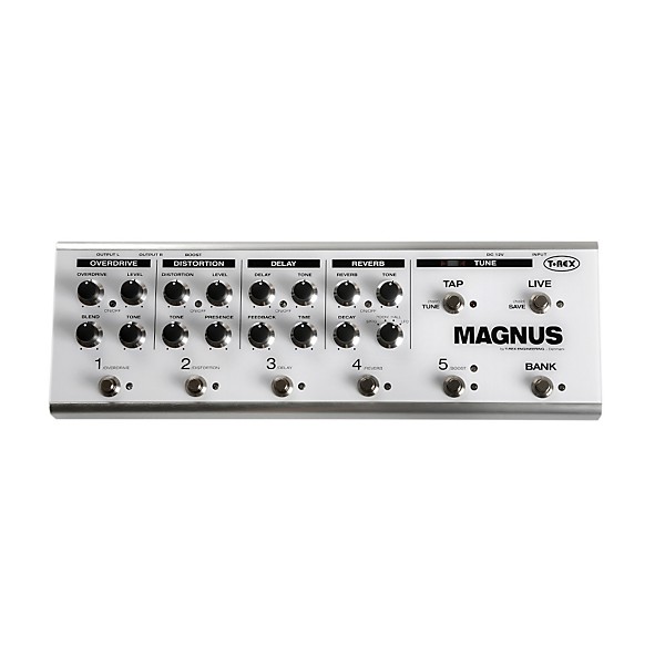The effects in Magnus “ Overdrive; Distortion; Delay with Tap Tempo; Reverb; and Boost are all derived from classic T-Rex pedals used by professional guitarists all over the world. Magnus features 2 modes of operation. In œLive mode, the controller acts as 5 separate effect pedals that can be switched on and off at will. In œPreset mode, the player can activate up to 10 different pre-set combinations of the five onboard effects. Finally, Magnus boasts a simple, convenient onboard tuner that allows for silent tuning, any time.