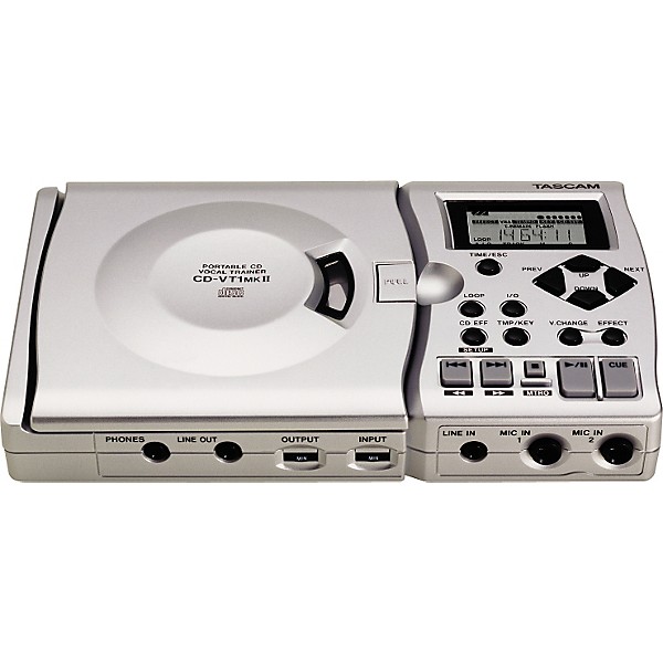 The TASCAM CD-VT1mkII Portable CD Vocal Trainer will improve your performances dramatically. With a wealth of high-tech features like slow speed audition that lets you change the speed of playback without changing pitch, a seamless loop function to let you practice difficult passages over and over, multi-effects including vocal pitch shifter to enhance your performance quality, and a cue function. Plug 2 mics directly in and listen through headphones or send a mix through the line out to record. Voice-cancel function will remove center-panned vocals. New functions include split monitoring, a metronome, and reference pitch oscillators for tuning. Works great for instruments as well. Runs on batteries or optional power supply.