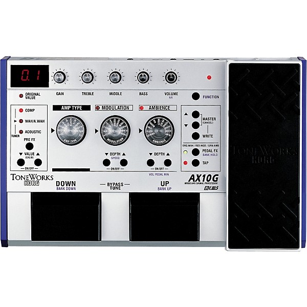 The Toneworks AX10G Guitar Modeling Effect Processor is a compact multi-effect processor that packs a ton of dead-on amp and effect models generated using Korg's highly acclaimed REMS modeling technology. 11 amp models. 26 carefully selected effects. 40 preset and 40 user-editable programs cover all musical styles. Knob-based controls include a tap switch for setting delay. Output amp/line switch for live or studio flexibility. Program lock/hold function to prevent onstage accidents. The expression pedal offers realtime control of your sound.