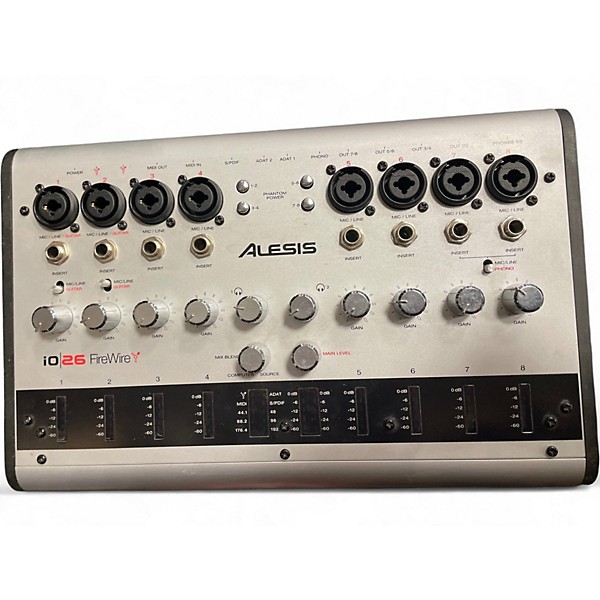 Used Alesis io|26 FireWire unpowered mixer/audio interface in great condition, ideal for home and mobile recording. Features 26-in/26-out FireWire connectivity, 8 high-quality mic preamps with phantom power, 24-bit/96kHz audio support, multiple analog and digital I/O (including ADAT and S/PDIF), MIDI I/O, and onboard DSP mixing for low-latency monitoring. A reliable, great-sounding hub for tracking full bands, drums, and multi-mic sessions.