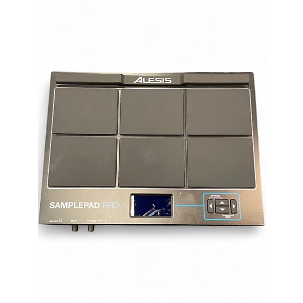 Used Alesis SamplePad Pro in excellent condition—this versatile drum MIDI controller features 8 dual-zone rubber pads with blue LED illumination, over 200 onboard sounds, and 10 preset kits. It includes SD card storage (up to 32GB), allowing custom sample loading, and extensive connectivity with USB-MIDI, 1/4" trigger inputs, and stereo outputs. Ideal for studio or live performance, the SamplePad Pro offers responsive playability and robust compatibility with electronic setups.