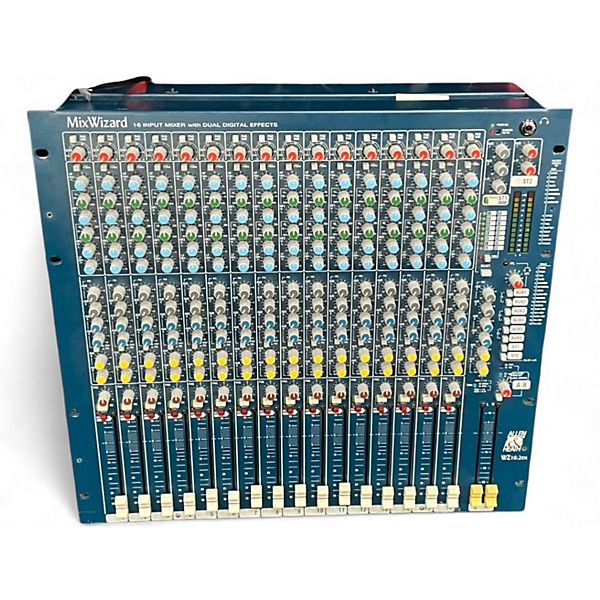 Used Allen & Heath MixWizard WZ16:2DX unpowered mixer in fair condition, offering 16 mono channels with 4-band EQ, 6 aux sends, and built-in digital FX. Ideal for small venues or recording setups, this analog console features balanced XLR and TRS inputs, direct outs per channel, and dual stereo returns. Ruggedly built for reliable performance, it's a versatile solution for live sound or studio work, despite visible cosmetic wear from previous use.