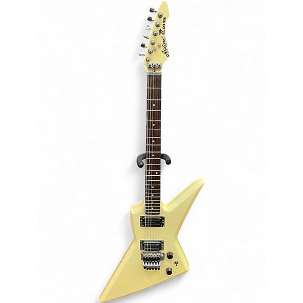 Used Aria Pro II ZZ Deluxe Olympic White electric guitar in good condition, featuring a distinctive angular solid body design. Equipped with dual humbucking pickups for powerful tone, a bolt-on maple neck with a rosewood fingerboard, and a 22-fret setup. This 1980s-era guitar offers vintage appeal with responsive controls, a 3-way selector switch, and individual volume and tone knobs. Perfect for players seeking classic hard rock sound with eye-catching style and reliable performance.