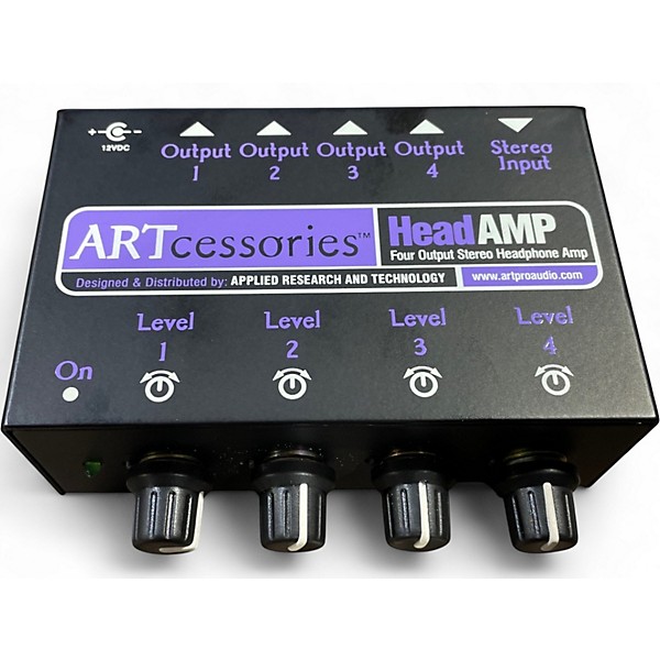 Used Art HeadAMP Headphone Amplifier in great condition, delivering high-quality sound with ultra-low noise operation. Compact and rugged, it features four independent 1/4" outputs with individual volume controls, powered by a single stereo input. Ideal for studio or personal use, it supports up to four pairs of headphones simultaneously with minimal distortion. This reliable, high-performance amp ensures clear monitoring, making it a perfect addition to any audio setup.