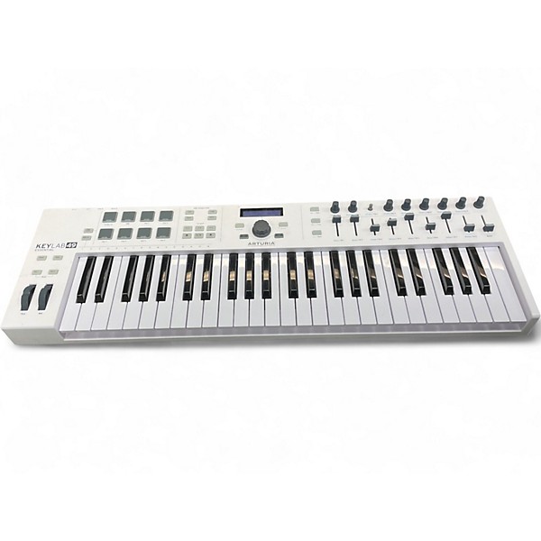 Used Arturia KeyLab 49 MIDI Controller in good condition, featuring 49 semi-weighted keys with velocity sensitivity, 16 RGB backlit performance pads, 9 faders, and 9 rotary knobs for hands-on control. Seamlessly integrates with Analog Lab, Ableton Live, and most major DAWs via USB or MIDI. Its durable aluminum and wood construction ensures reliability for both studio and stage use. This versatile controller is perfect for producers and musicians seeking expressive control and workflow enhancements.