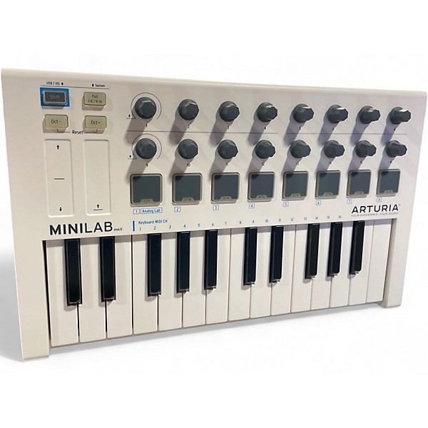 Create and perform anywhere with this Used Arturia MiniLab MIDI Controller in good condition. This compact USB MIDI keyboard features 25 velocity-sensitive slim keys, 8 rotary encoders, 2 touch strips for pitch and modulation, and responsive pads for triggering sounds and clips. Plug-and-play over USB with bus power makes it ideal for laptops and mobile setups, while seamless DAW integration helps you record, tweak parameters, and stay in the flow in the studio or on stage.