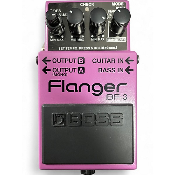 The used BOSS BF-3 Flanger delivers rich stereo flanging with dual modes for guitar and bass. In good condition, this compact stompbox features ultra-wide sound, Momentary mode for press-and-hold effects, and Tap Tempo for syncing rate to your groove. Built tough with standard 1/4" input/output jacks and powered by 9V battery or adapter, the BF-3 adds dynamic movement and depth to your tone, making it ideal for live or studio use.