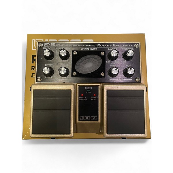 Experience rich, authentic rotary speaker sounds with this used BOSS RT-20 Rotary Ensemble pedal in great condition. Powered by COSM technology, it delivers adjustable Rise Time, Horn and Bass speed, and Overdrive for vintage tone shaping. Stereo outputs and visual spinning speaker display enhance both sound and stage presence. Perfect for guitarists and keyboardists seeking classic rotary effects with modern flexibility, all in a durable twin-pedal chassis built for long-lasting performance.
