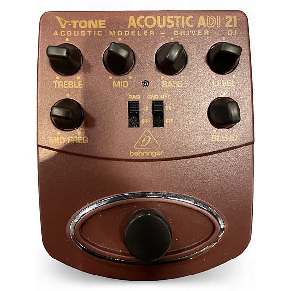 Used Behringer ADI21 V-Tone Acoustic Driver DI box in great condition, offering warm, tube-like tones for acoustic guitars. Features include a 3-band EQ with sweepable mids, ground lift switch, and balanced XLR and 1/4" outputs. Perfect for stage or studio, the ADI21 adds depth and clarity to your sound while reducing feedback. Powered by a 9V battery or DC adapter, it's a versatile tool for any performing or recording acoustic guitarist.