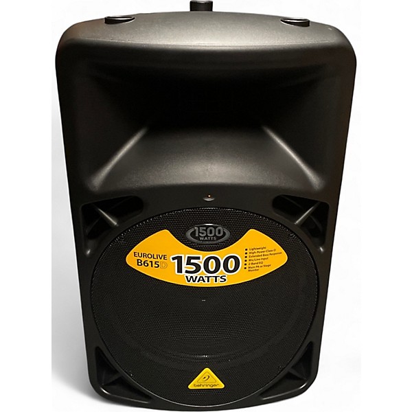 Used Behringer Eurolive B615D Powered Speaker in excellent condition, delivering 1500 watts of clean Class-D power through a 15" LF driver and 1.75" HF compression driver. This reliable PA speaker offers rich bass, clear highs, and built-in active EQ and overload protection for professional sound in any setting. Features include XLR and 1/4" combo input, mic/line switch, and tiltable enclosure for floor or pole mounting—perfect for DJs, bands, or mobile sound setups.