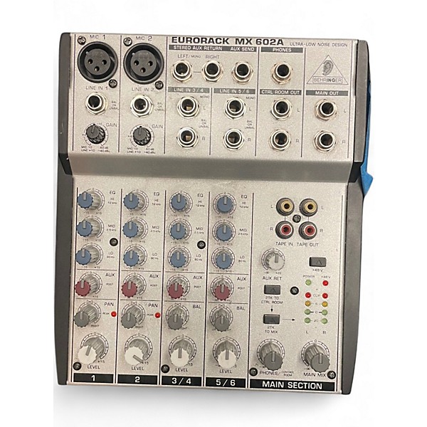 Used Behringer Eurorack MX602A 6-channel unpowered mixer in good condition, perfect for small recording setups or live performances. Features two mono channels with XLR and 1/4" inputs, two stereo line-level channels, 3-band EQ on mono inputs, and overall low-noise operation. Offers separate main mix and control room outputs, headphone jack, and phantom power for condenser mics. Compact and reliable, this mixer delivers clear audio and essential mixing control in a portable design.