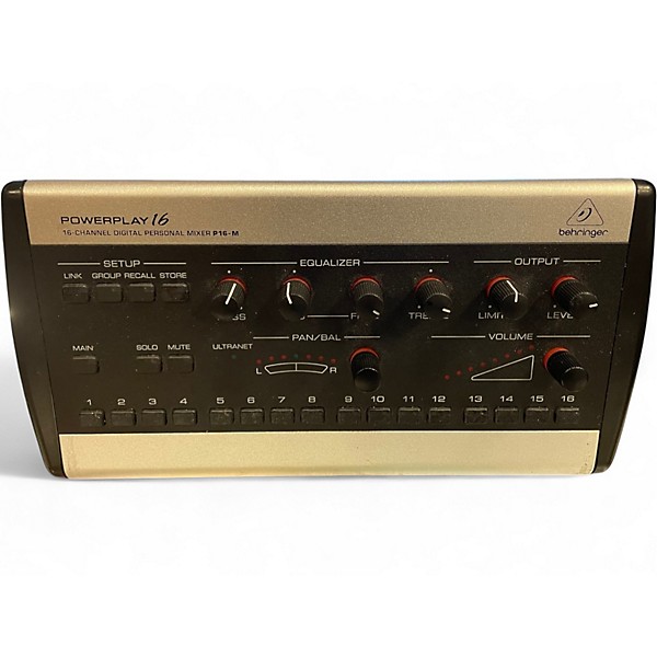 Get hands-on personal monitoring with this Used Behringer Powerplay P16-M Digital Mixer in great condition. Control up to 16 channels with intuitive level, pan, solo, and mute, plus built-in 3-band EQ and limiter per channel for a polished in-ear or wedge mix. Features a high-power headphone output, balanced line output, and Cat5 Ultranet connectivity for simple daisy-chaining in live or studio setups. Rugged, compact, and ready to work.