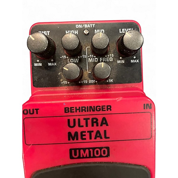 Unleash searing, amp-like distortion with this used Behringer UM100 Ultra Metal effect pedal in good condition. Designed for electric guitar, it delivers tight lows and aggressive highs with dedicated Distortion, Level, Low, Mid, and High controls plus a sweepable Mid Frequency knob for precise tone shaping. Rugged compact stompbox format with true bypass-style footswitching for stage-ready operation, it runs on a 9V battery or standard 9V DC power supply.