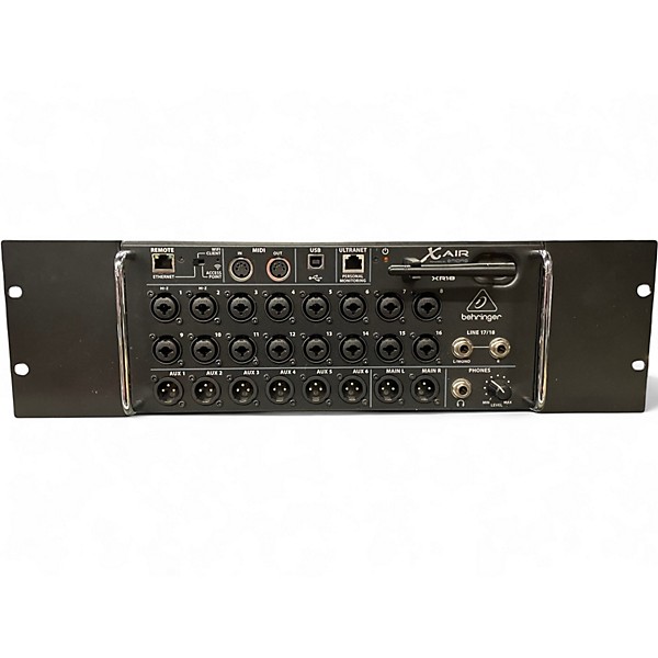 Used Behringer X Air XR18 digital mixer in good condition, ideal for live sound and studio recording. This 18-input, 12-bus rackmount mixer features 16 Midas-designed mic preamps, built-in Wi‑Fi for wireless control, and a 24-bit/48 kHz USB audio interface for multitrack recording. Includes powerful onboard DSP with EQ, compression, gates, and effects, plus flexible routing and scene recall for fast, consistent setups.