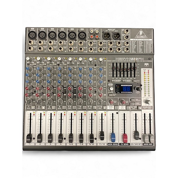 Used Behringer Xenyx 1222FX Unpowered Mixer in good condition, featuring 6 mic preamps, built-in 24-bit FX processor with 100 presets, and 3-band EQs with sweepable mids on mono channels. This versatile mixer offers four stereo channels, balanced XLR outputs, and integrated USB/audio interface for easy digital recording. Ideal for live sound or studio use, the Xenyx 1222FX delivers reliability and flexibility in a compact design.