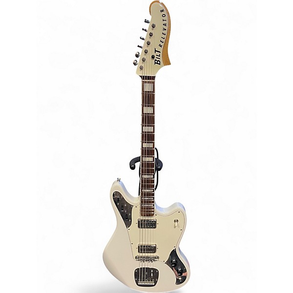 Used BILT RELEVATOR White Solid Body Electric Guitar in great condition, featuring an offset alder body, maple neck with rosewood fingerboard, and dual humbucker pickups for bold, versatile tones. It includes a Mastery bridge and vibrant finish for both style and performance. A 25.5" scale length and 22 frets offer smooth playability, ideal for players seeking classic looks and modern functionality. This uniquely styled guitar delivers tone and comfort for any genre.
