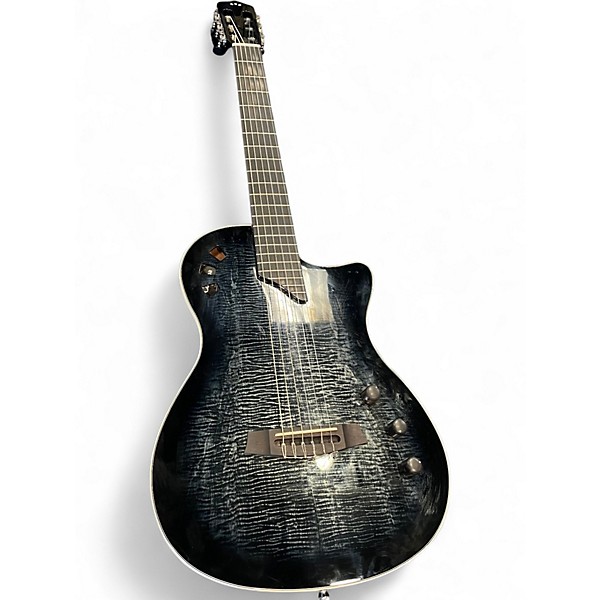 Used Cordoba STAGE BLACK Classical Acoustic Electric Guitar in great condition, featuring a solid Spruce top with a flame Maple veneer, chambered Mahogany body, and ergonomic contours for comfortable play. Equipped with a Córdoba Stage Pickup System co-developed with Fishman, it delivers rich nylon-string tone amplified or acoustic. The full-scale 25.6" fingerboard and fast-playing neck make it perfect for both classical and modern styles, while its sleek black finish adds a striking visual appeal.