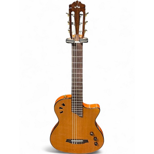 Experience superb playability with this used Cordoba Stage Nylon Natural Classical Acoustic-Electric Guitar, in excellent condition. Featuring a solid spruce top with flamed maple veneer, chambered mahogany body, and a comfortable thin body design, it offers rich nylon tone with minimal feedback. Equipped with Cordoba’s Stage Pickup System for pristine amplified sound, this versatile guitar is perfect for both live and studio use. Its elegant natural finish highlights its modern aesthetic and classic craftsmanship.