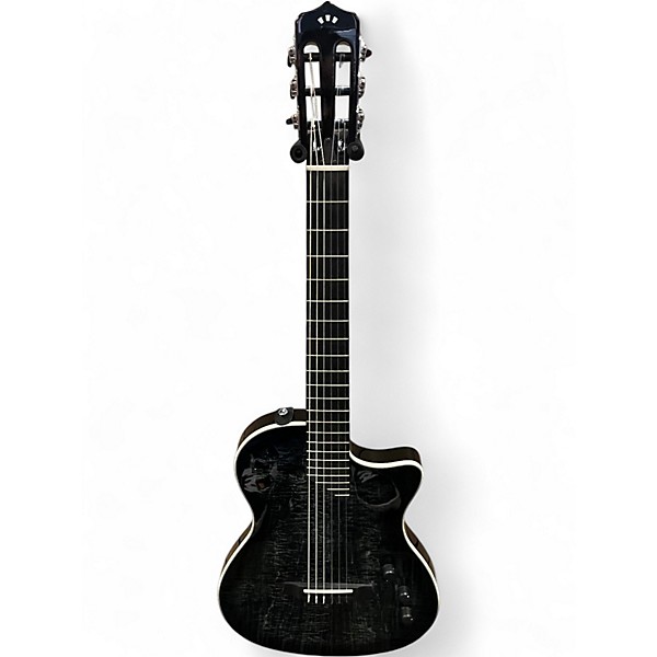 Experience rich nylon tones with the used Cordoba Stage Nylon Quilted Black guitar, a stunning classical acoustic-electric in great condition. Featuring a comfortable chambered mahogany body, solid spruce top, and eye-catching quilted maple veneer, it delivers vibrant sound both unplugged and amplified via Cordoba’s Stage Pickup System. The slim C-shaped mahogany neck and pau ferro fingerboard offer superb playability, making it ideal for performers seeking elegance, versatility, and smooth classical tone on stage or in studio.