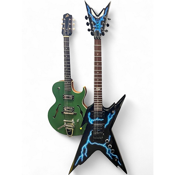 Used Dean Dimebag Razorback LIGHTNING electric guitar in excellent condition, featuring a striking lightning bolt finish, mahogany body, set mahogany neck, and rosewood fingerboard with 22 frets. Equipped with high-output humbuckers and a Floyd Rose tremolo system for powerful tone and dive-bomb action, this solid body guitar delivers legendary Dimebag Darrell style and sound. Perfect for metal and rock players seeking iconic looks and aggressive performance in a premium pre-owned instrument.