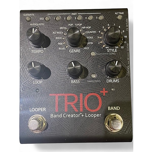 Used DigiTech Trio+ Band Creator Plus Looper Pedal in good condition. This powerful pedal automatically generates bass and drum accompaniment based on your guitar playing, with 12 music genres and 12 song styles per genre. Features include a built-in looper, programmable song parts, and SD card storage for expanded looping. Perfect for solo practice or songwriting, it offers intuitive controls and reliable performance for guitarists seeking creative flexibility.