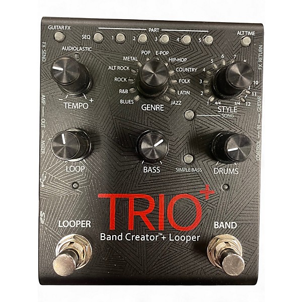 Used DigiTech Trio+ Band Creator Plus Looper Pedal in Good condition. This innovative pedal automatically generates bass and drum accompaniment to match your guitar playing, with up to 12 genres and 12 styles per genre. Features built-in looper, tempo control, and unlimited overdubs using a micro SD card. Great for solo performers and practice sessions, it adds dynamic depth to your sound. Includes guitar FX and adjustable part intensity for creative flexibility.