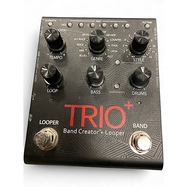 Used DigiTech Trio+ Band Creator Plus Looper Pedal in good condition. This versatile pedal automatically generates bass and drum accompaniment based on your guitar playing. It features 12 music genres, 12 song styles per genre, a built-in looper with unlimited overdubs, and a tempo adjustment knob. Perfect for solo practice or songwriting, the Trio+ offers intuitive controls and high-quality sound, making it an essential tool for any guitarist looking to enhance their performance.